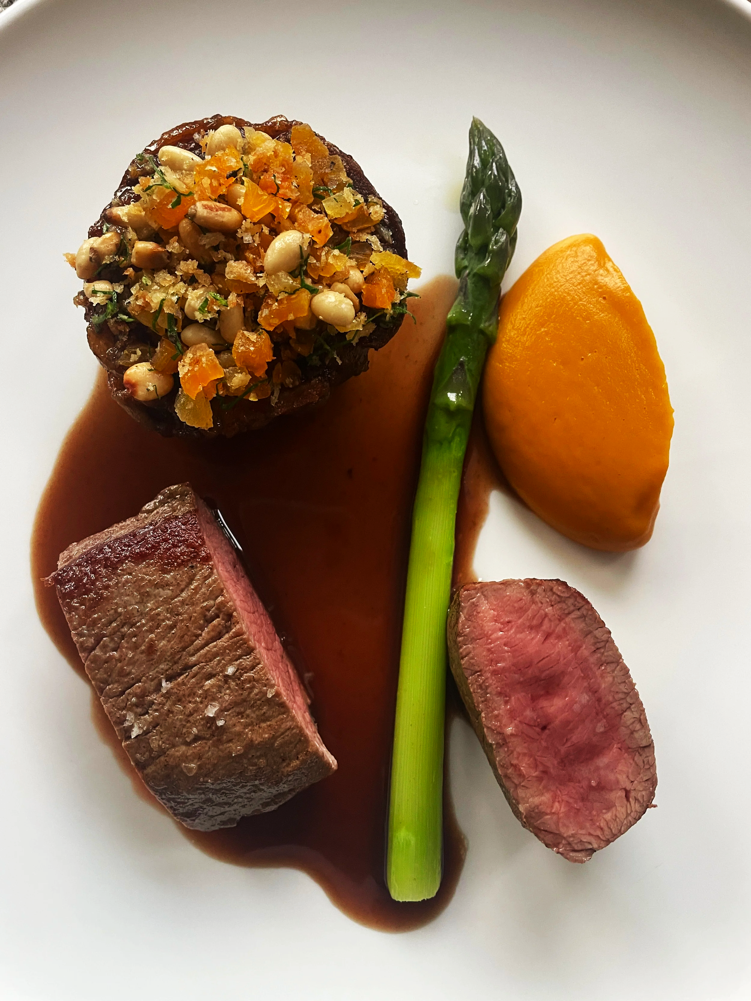 Lamb two ways - pan roasted lamb loin, slow cooked shoulder, pumpkin puree, lamb jus, apricot and pine nut crumble